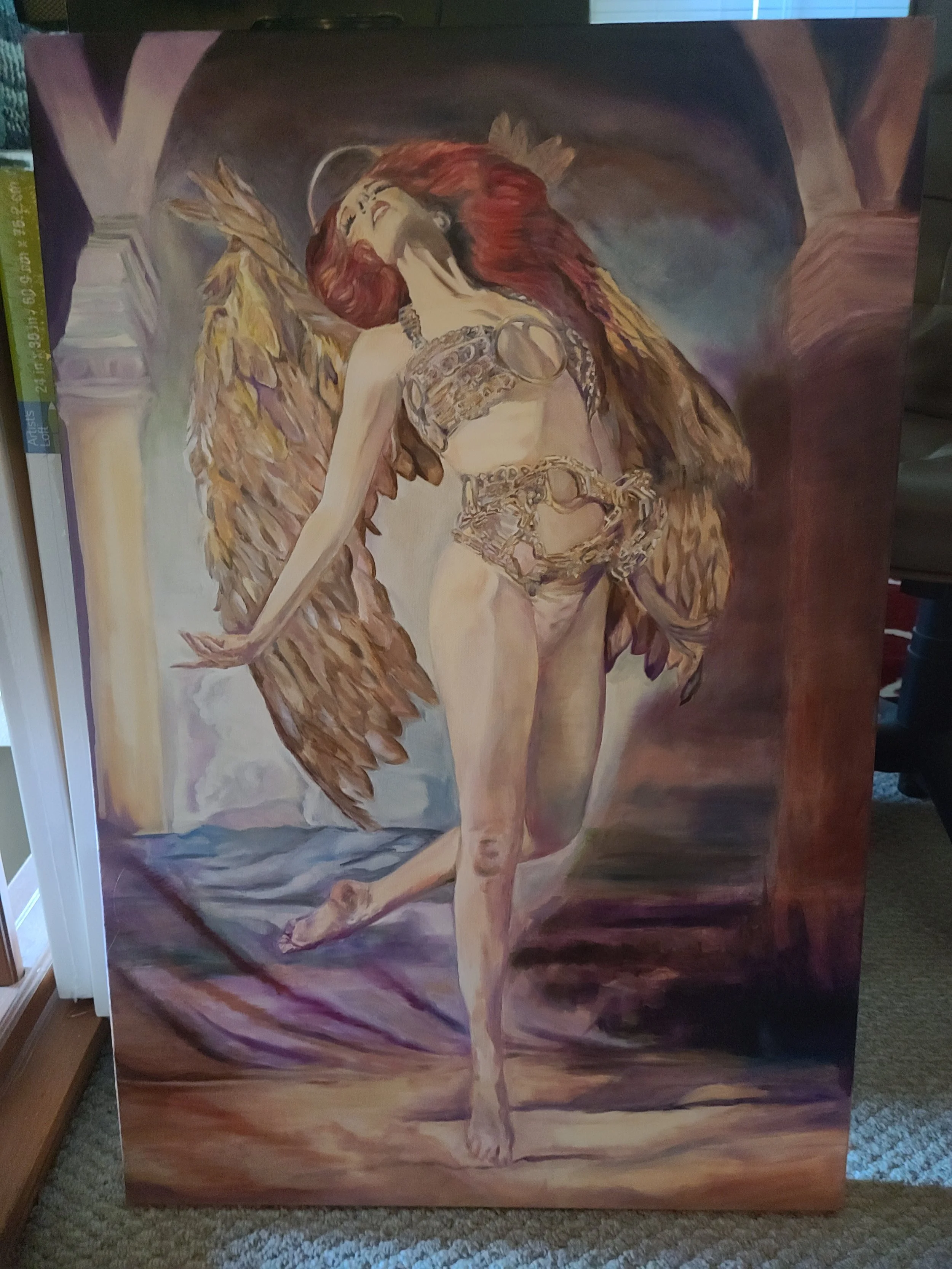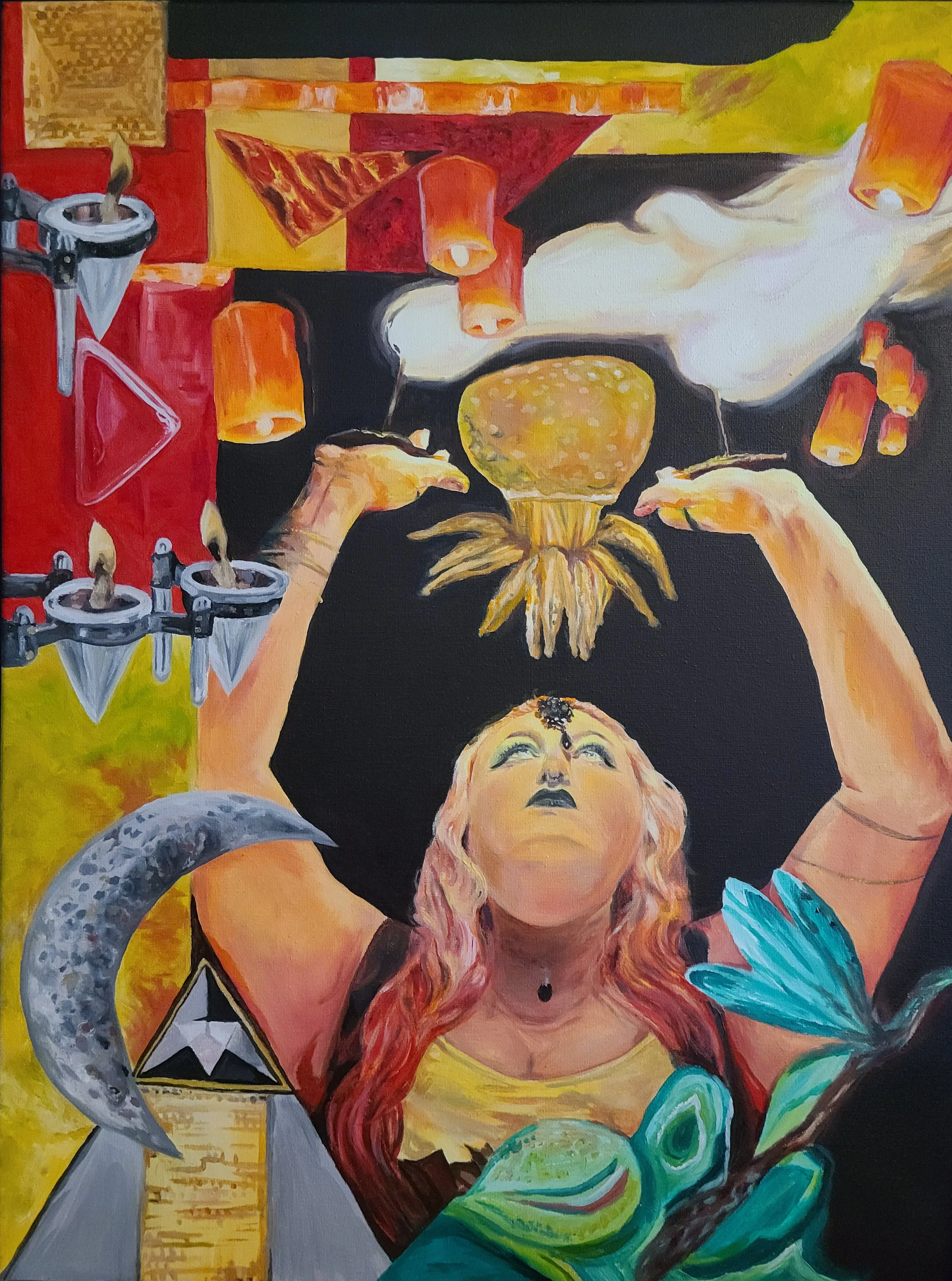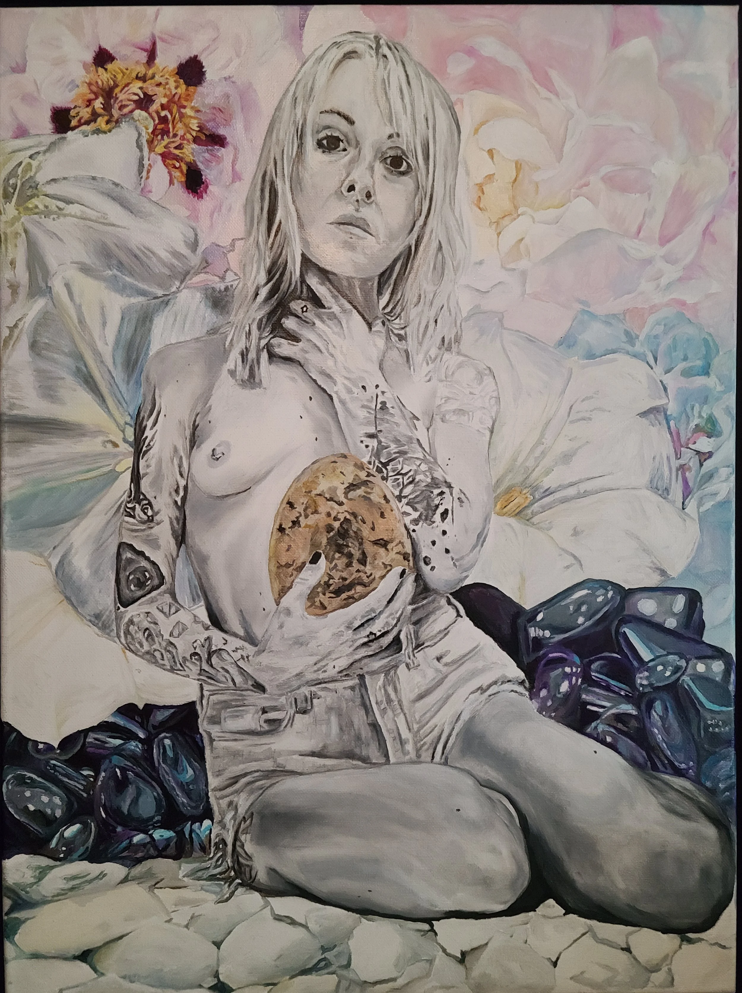 The artist investigated her first self-portrait in oils, as well as portrait in black and gray. The portrait The Call of The Void investigates the overcoming and the reclaiming of self and choosing life despite struggles, one must bloom in the darkness and choose life. The series in project one investigates this process over a two year period, through the dark parts and then finding oneself emerging free again.